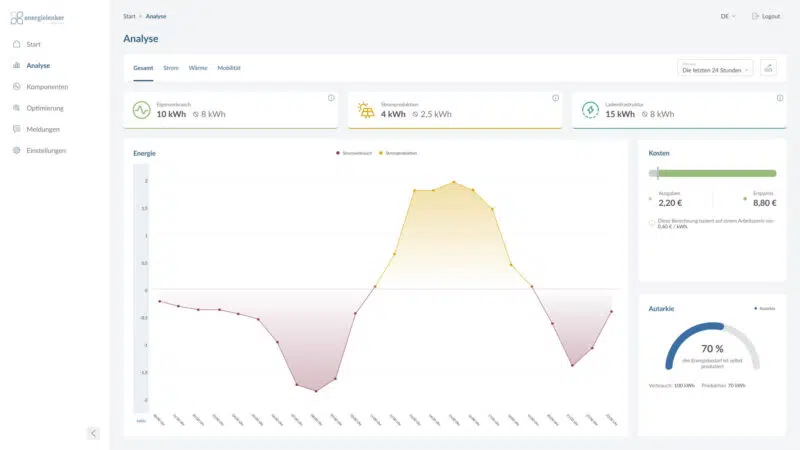 Die Analysefunktion von Enbas ermöglicht einen detaillierten Einblick in die Energieflüsse. Wie viel des verfügbaren PV-Stroms wurde dank Enbas für Ladeinfrastruktur, Wärme oder insgesamt verbraucht? Wie viel Energie lässt sich noch einsparen und wie unabhängig sind Sie eigentlich vom Stromnetz? Die Antworten auf all diese Fragen liefert Enbas!