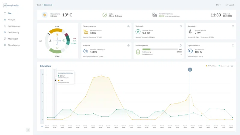 Zeigt Verbrauch, Einspeisung und Ersparnisse transparent in Echtzeit.