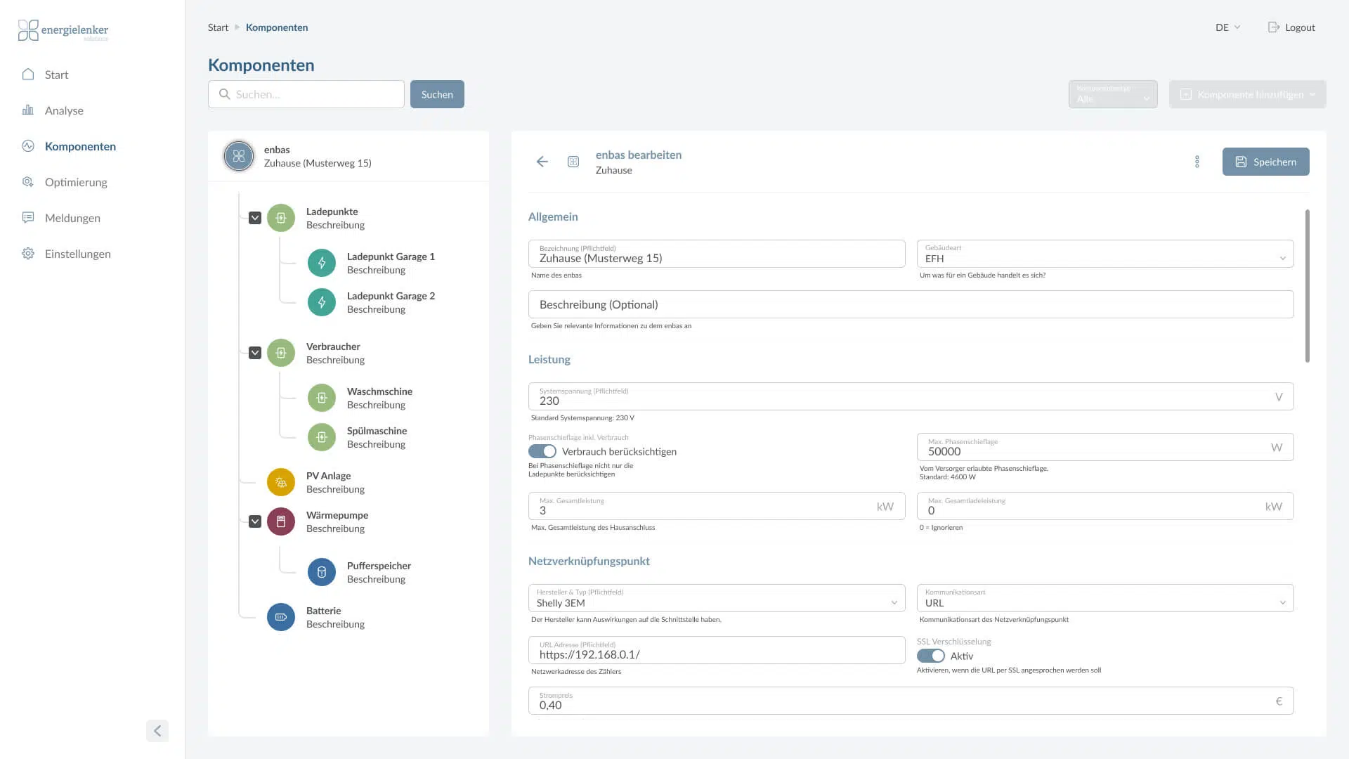 Egal ob Wärmepumpe, PV-Anlage, Ladepunkte oder weitere Verbraucher, hinterlegen Sie alle relevanten Informationen und passen Sie das System unmittelbar an Ihr Gebäude an. Weitere Informationen dazu, wie Enbas als Home Energy Management System Energieflüsse optimiert und überwacht, finden sich in unserem Blogbeitrag “Intelligenter Energiemanager für Gebäude“.